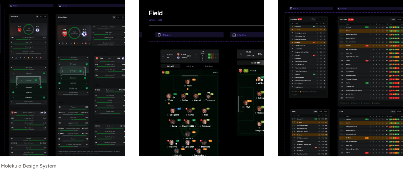 - Máme navigace, tabulky, grafy, karty, filtry, seznamy, formuláře nebo match detaily.